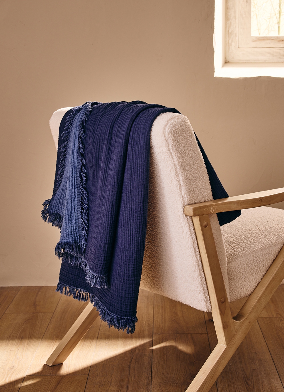 PLAID EN GAZE DE COTON à CARREAUX RÉVERSIBLE BLEU JEAN