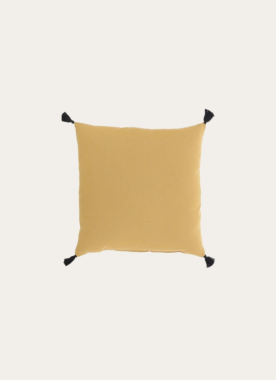 COUSSIN EN COTON UNI AVEC PETITS POMPONS MOUTARDE