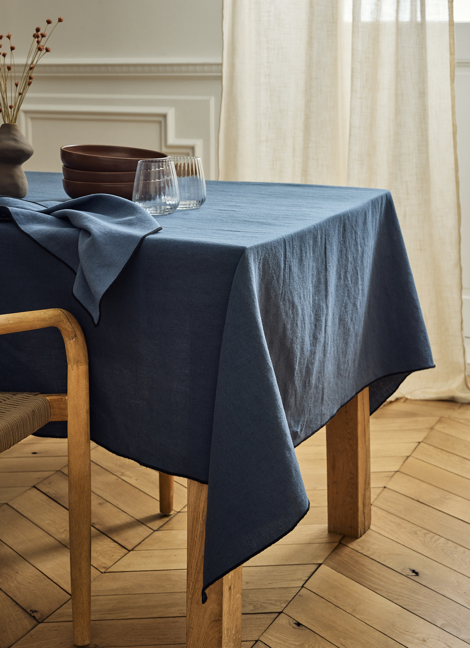 NAPPE UNIE à BOURDON CONTRASTÉ EN COTON ET LIN INDIGO