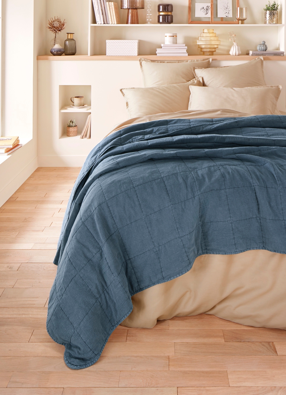 JETÉ DE LIT EN COTON LAVÉ NID D'ABEILLEMARINE
