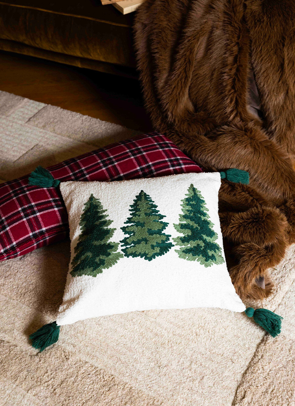 COUSSIN BRODÉ MOTIFS SAPINS AVEC POMPONS MULTICOLORE